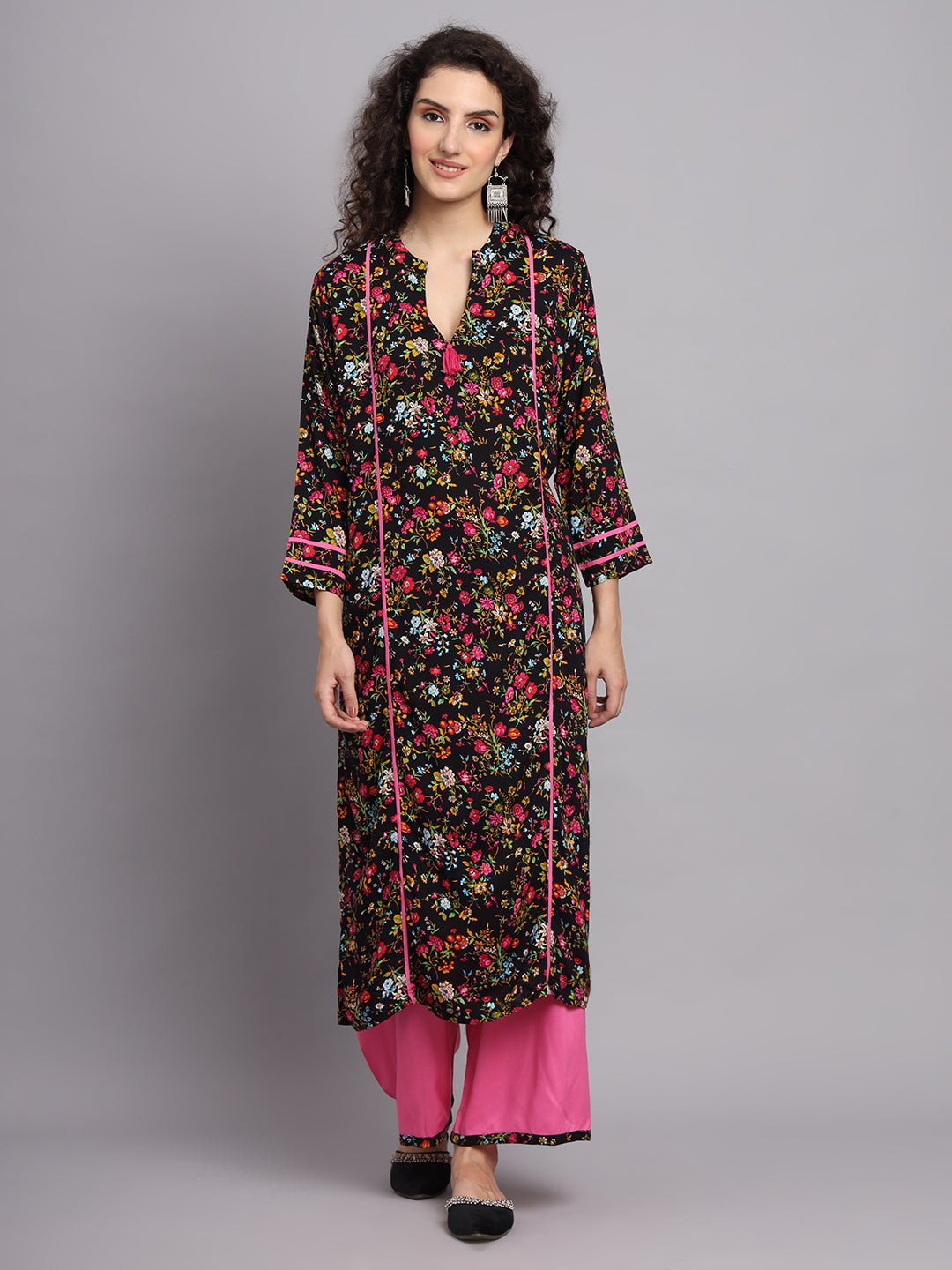 The Women's Black & Pink Floral Printed Kurta with Palazzo is not only a fashionable choice but also a comfortable and versatile option suitable for various occasions, making it an ideal addition to your wardrobe.