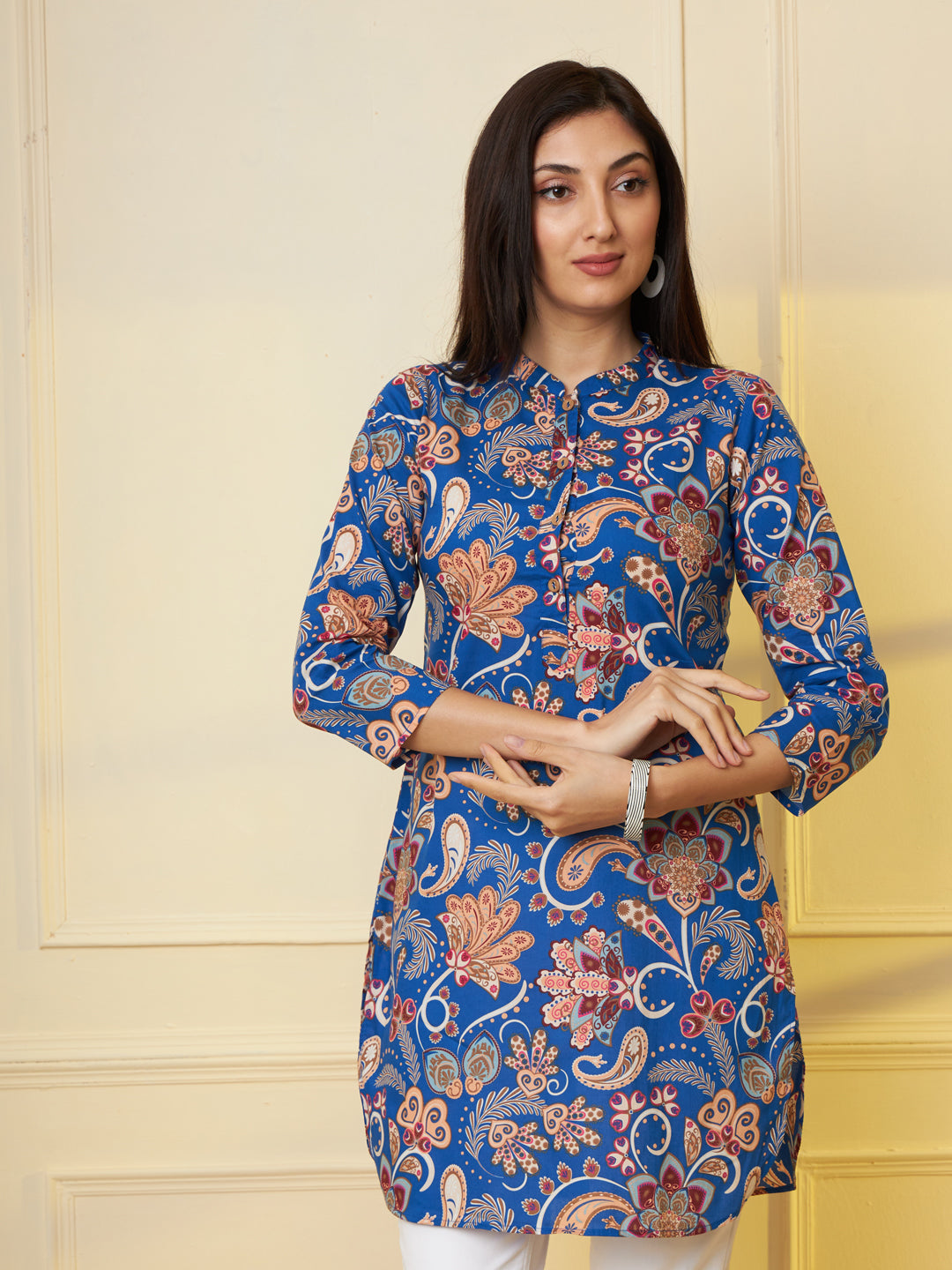 Introducing the Tissu Women's Blue Floral Printed Pure Cotton Kurti ƒ?? a versatile and stylish addition to your wardrobe. This kurti, crafted from pure cotton, offers a comfortable and breathable experience. With a length of 32 inches and 3/4 sleeves measuring 18 inches, it presents a graceful silhouette suitable for various occasions. The charming blue hue is adorned with a delightful floral print, and the thoughtful design includes side slits and a curved hemline, providing both freedom of movement and a modern aesthetic. For added comfort wear, the kurti features openable front buttons. Whether for casual outings, workwear, this kurti effortlessly combines style and functionality.