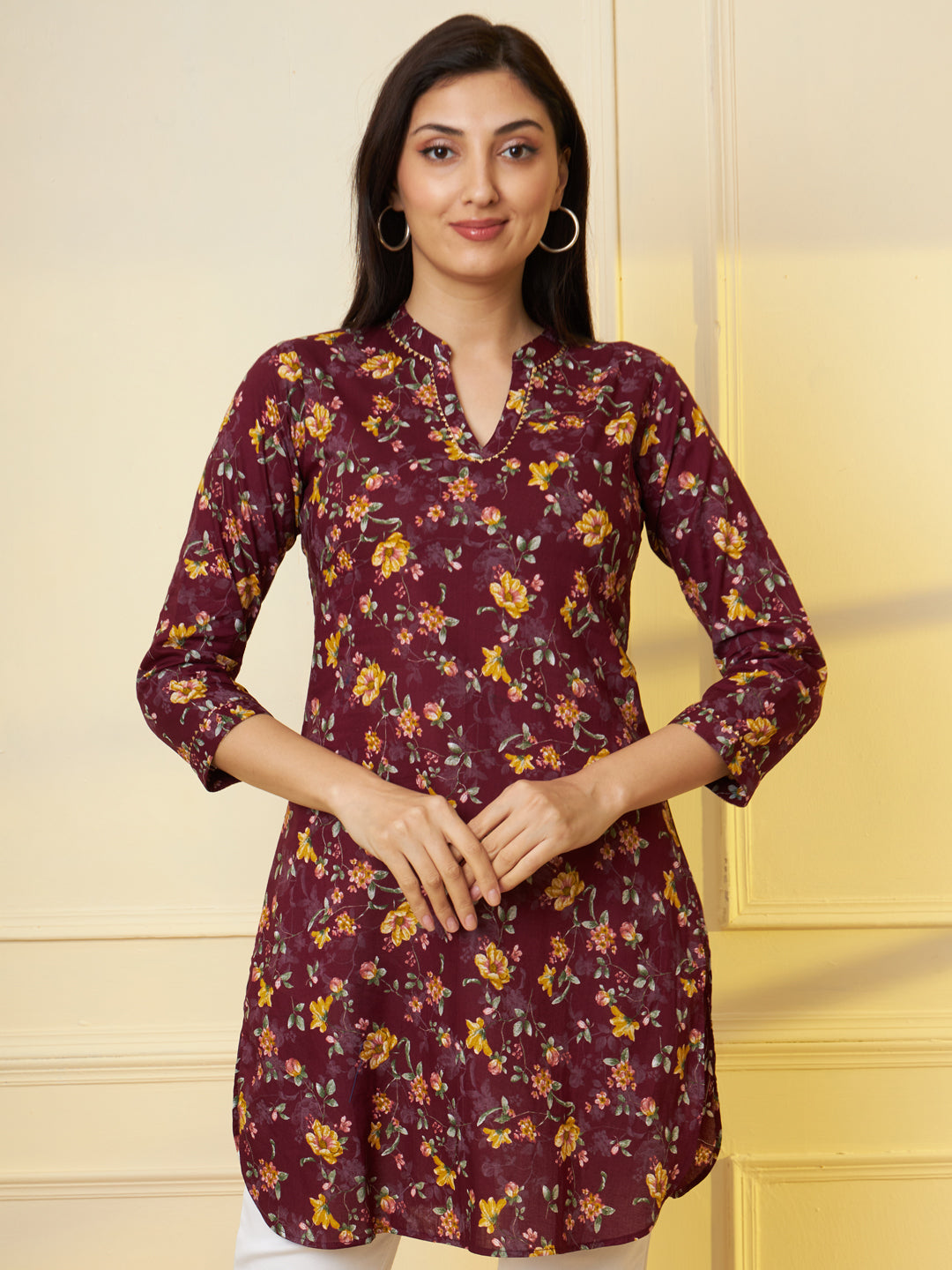 Introducing the Tissu Women's Maroon Floral Printed Pure Cotton Kurti ƒ?? a delightful blend of comfort and style. Crafted from pure cotton, this kurti guarantees a soft and breathable experience. With a length of 32 inches and 3/4 sleeves measuring 18 inches, it presents a graceful silhouette suitable for various occasions. The charming maroon hue, adorned with floral prints, is complemented by the thoughtful design featuring side slits and a curved hemline, ensuring both movement and contemporary flair. The added touch of lace work on the neck and sleeves adds a touch of elegance. Whether it's for casual outings, workwear, or daily use, this kurti ensures complete comfort, making you the central attraction wherever you go.