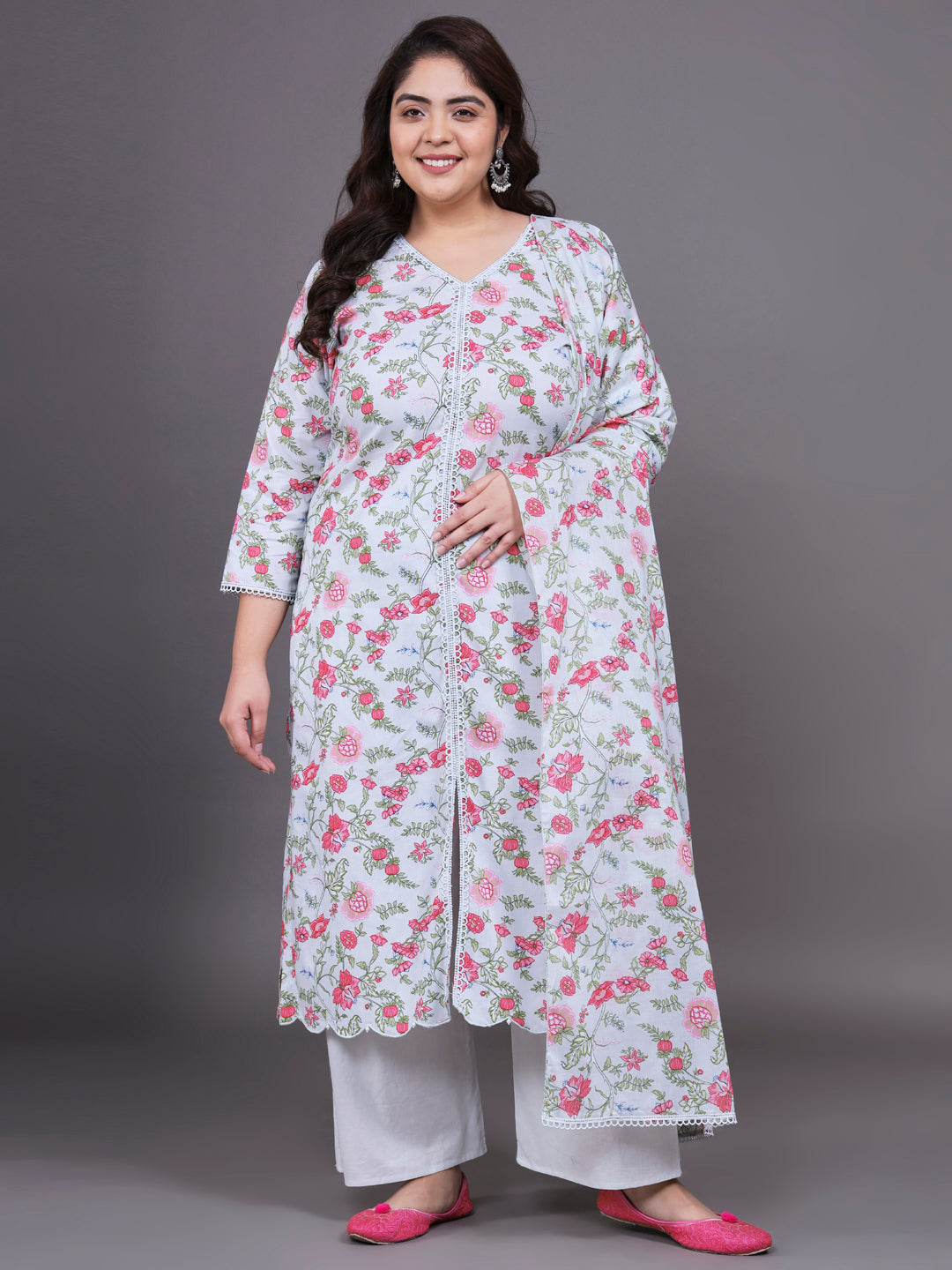 The Tissu Women's Plus Size Sage Green Floral Printed Pure Cotton Kurta & Palazzo With Dupatta is a stunning ensemble designed for plus-size women, featuring a kurta, palazzo pants, and a matching dupatta. Here are the details of this outfit: