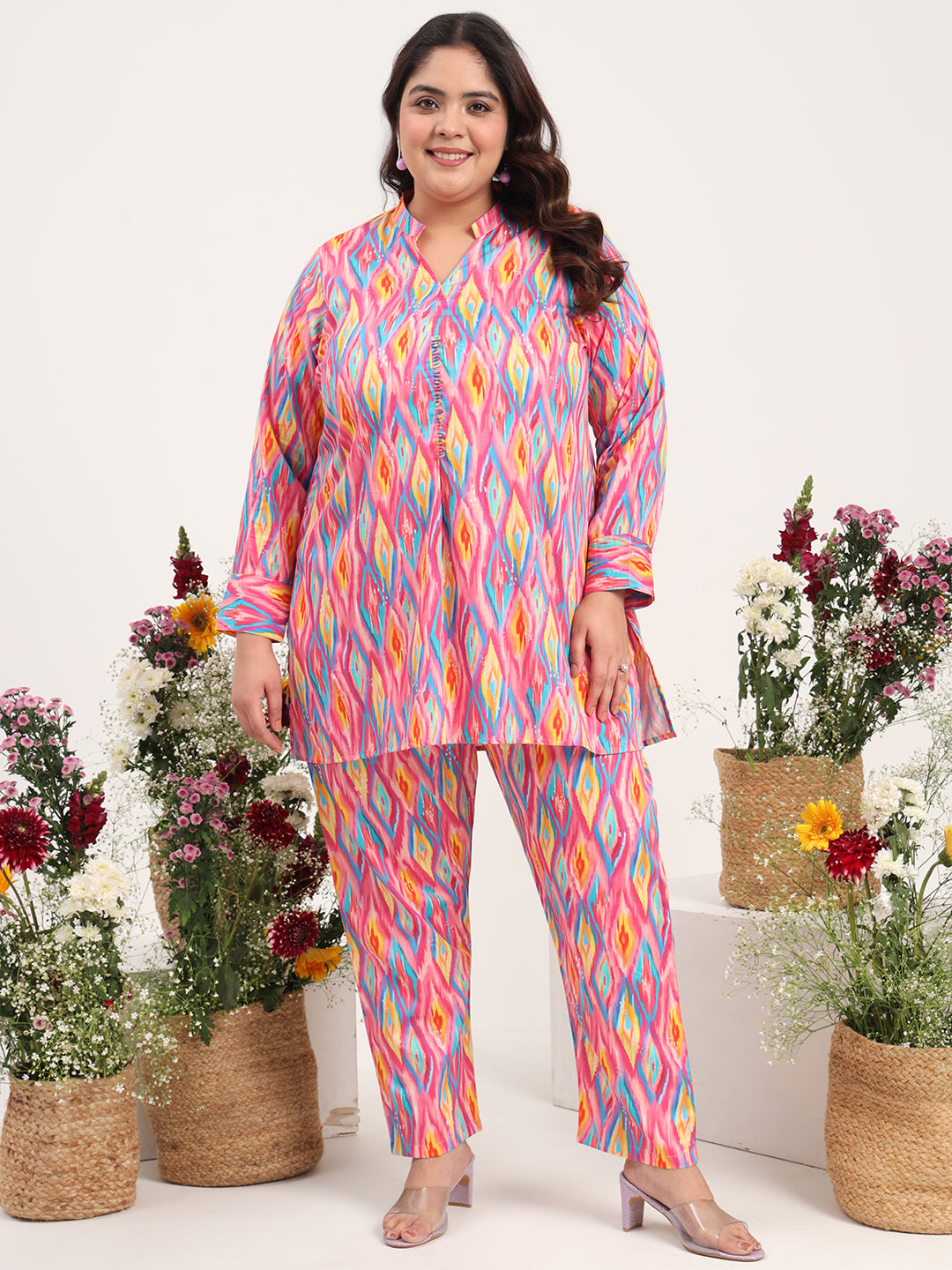 Women Plus Size Multicolor Cotton Satin Full Sleeves Tunic with Trouser Co-ord Set