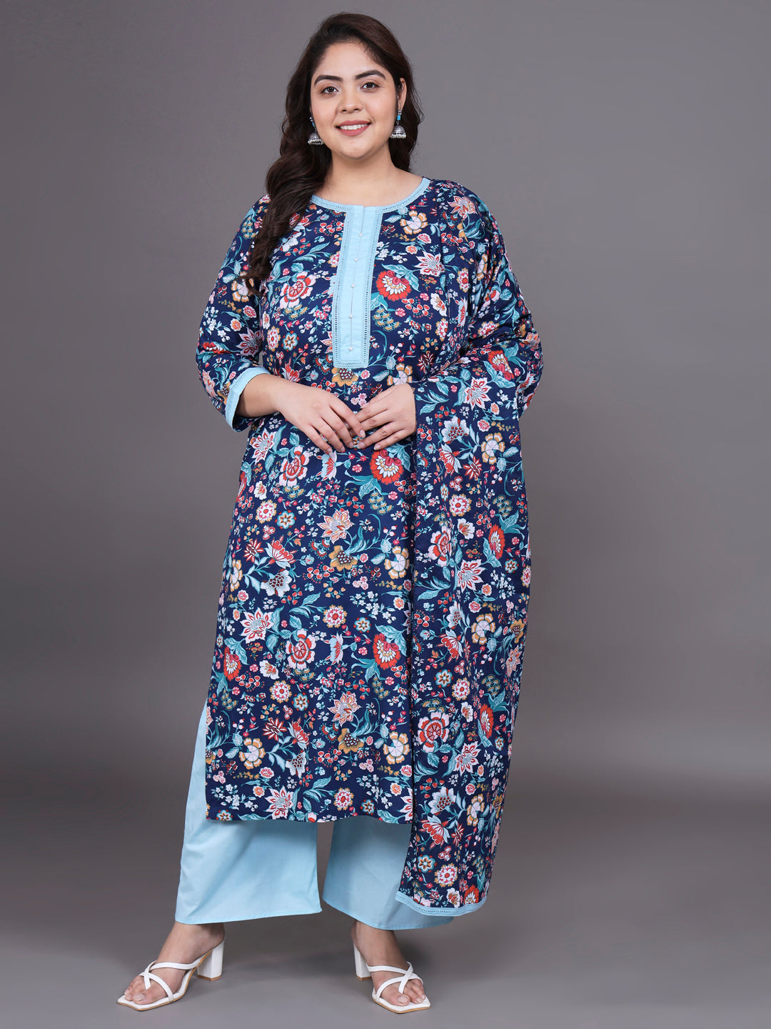 The Tissu Women's Plus Size Multicolor Floral Printed Pure Cotton Kurta & Palazzo With Dupatta is a stunning ensemble designed for plus-size women, featuring a kurta, palazzo pants, and a matching dupatta. Here are the details of this outfit:
