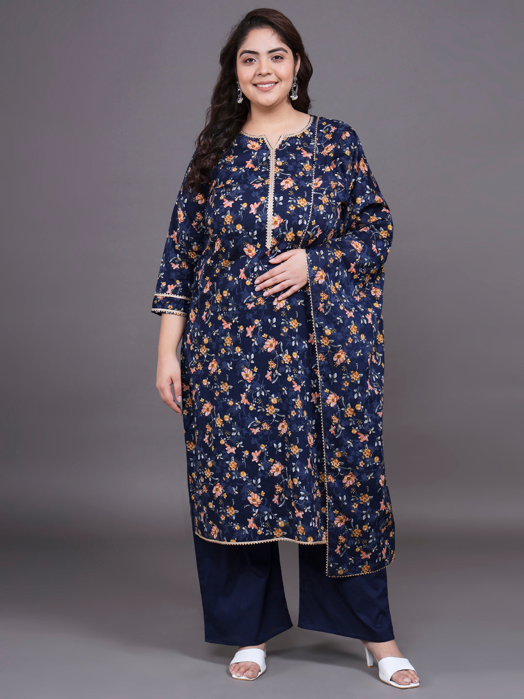 The Tissu Women's Plus Size Navy Blue Floral Printed Kurta With Palazzo & Dupatta is a delightful and fashionable outfit designed especially for plus-size women. This versatile set comprises a kurta, palazzo pants, and a coordinating dupatta, making it an excellent choice for both casual and festive occasions.