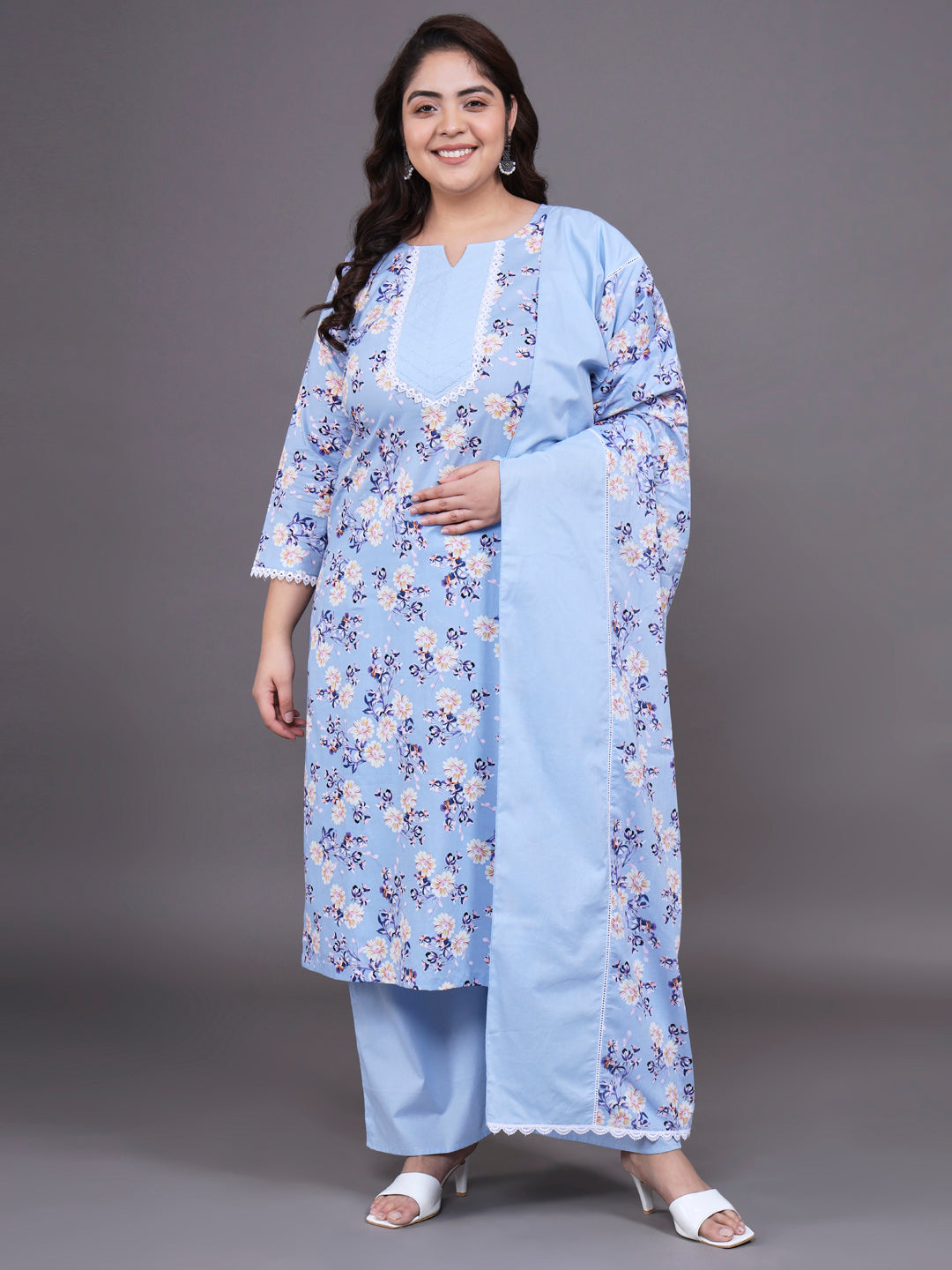 The Tissu Women's Plus Size Sky Blue Floral Printed Kurta With Palazzo & Dupatta is a delightful and fashionable outfit designed especially for plus-size women. This versatile set comprises a kurta, palazzo pants, and a coordinating dupatta, making it an excellent choice for both casual and festive occasions.