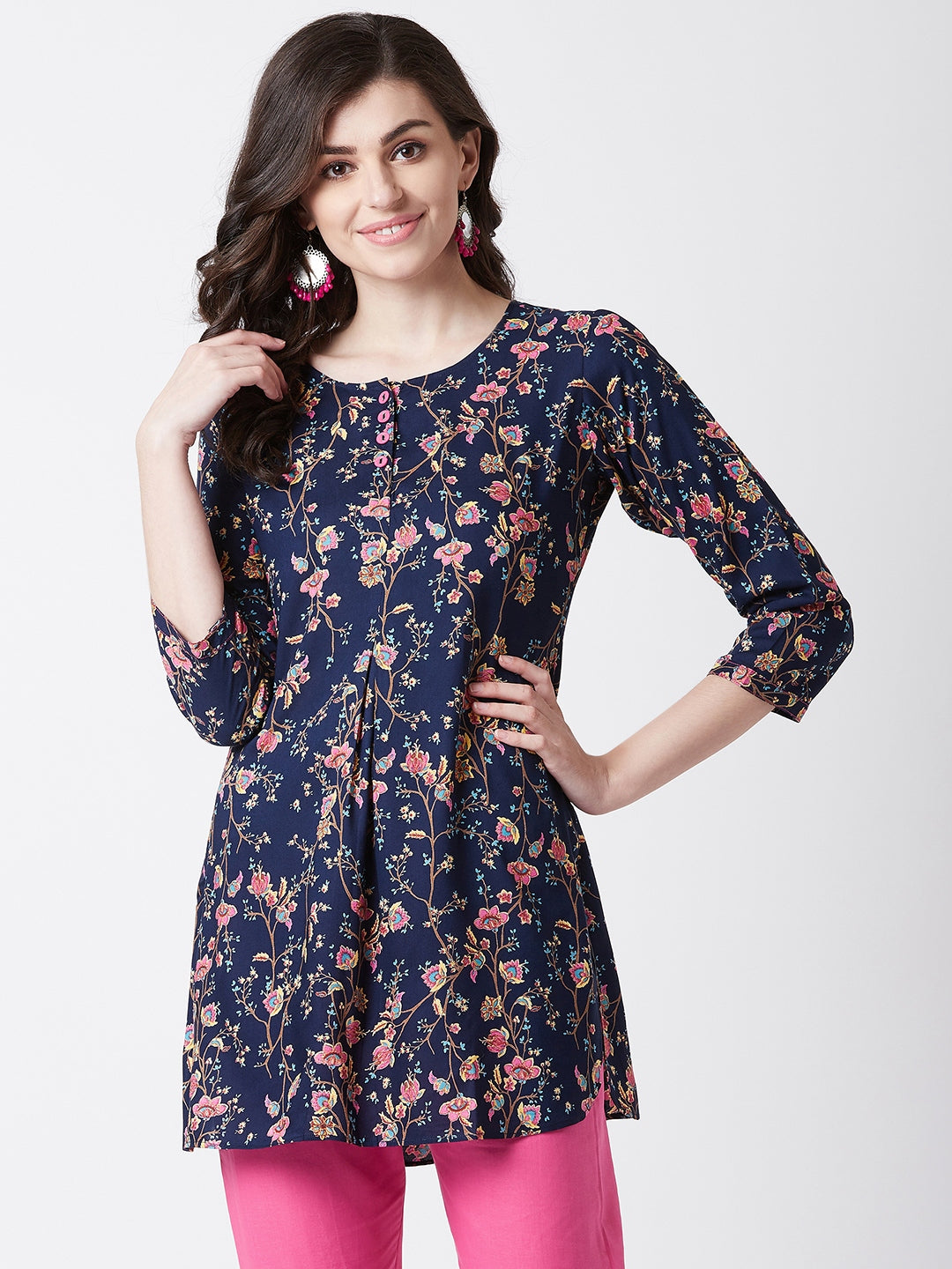 Tissu Women Rayon Navy Blue Floral Printed Straight Kurti combines softness, style, and thoughtful detailing, making it a versatile and fashionable choice for the modern woman's wardrobe.